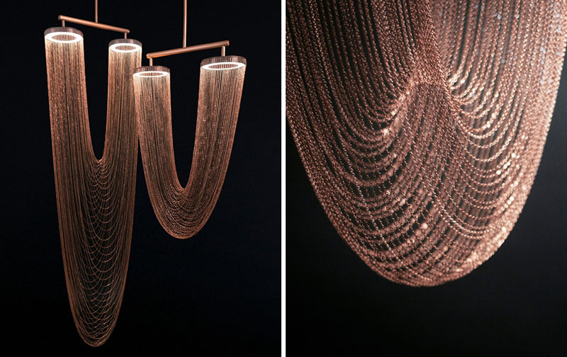 Con perfetta regolarità, ricordando la forma di una preziosa e raffinata collana pendente, queste lampade che formano una curva perfetta, sono realizzate con delicate catenelle di rame placcato e illuminate da un anello di luci a LED.